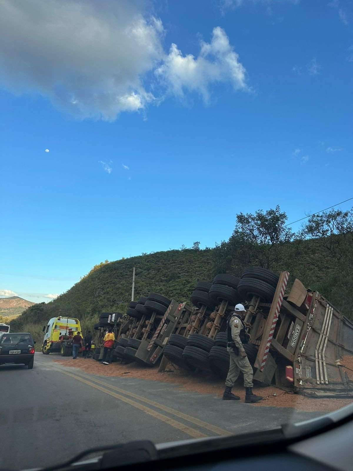 Uma carreta carregada de milho tombou na tarde desta segunda-feira (7), entre as cidades de Ouro Preto e Mariana. O motorista ficou preso às ferragens, mas foi rapidamente socorrido pelo Corpo de Bombeiros e sofreu apenas ferimentos leves.