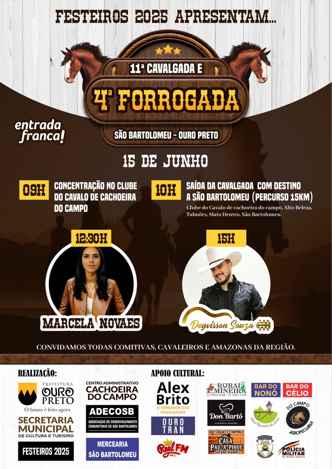 No próximo dia 15 de junho, São Bartolomeu, distrito de Ouro Preto, será o destino de cavaleiros, amazonas e amantes da cultura rural com a 11ª Cavalgada e Forrogada, evento tradicional promovido pelos Festeiros 2025. A programação tem entrada franca e promete movimentar a região com música, tradição e confraternização.