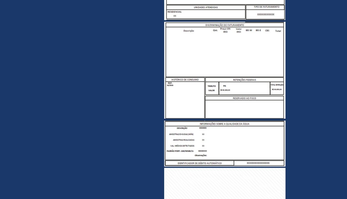 A mudança atende às diretrizes da Reforma Tributária do Consumo. Agora, a fatura passa a ser denominada Documento Auxiliar da Nota Fiscal de Água e Saneamento Eletrônica (Danfe-AG) e será a versão impressa da Nota Fiscal de Água e Saneamento Eletrônica (NFAg). A consulta da Nota Fiscal de Água e Saneamento Eletrônica poderá ser feita ao longo do ano, a depender de definições de órgãos governamentais.