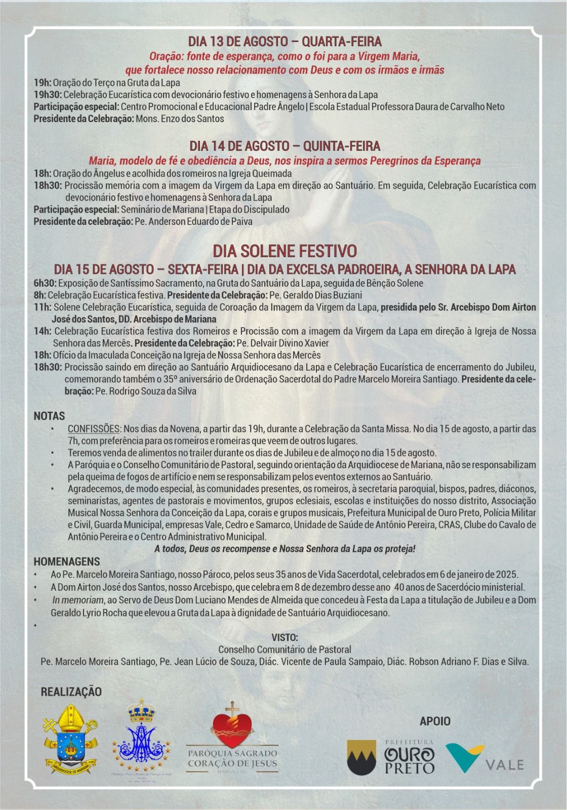Com mais de três séculos de história, o Festa (ou Jubileu) da Lapa é uma das romarias mais antigas de Minas Gerais e movimenta o turismo religioso e cultural de Ouro Preto. Neste ano, o evento também celebra o 35º aniversário de ordenação sacerdotal do pároco e reitor do Santuário, Padre Marcelo Moreira Santiago, e será realizado dentro do contexto do Ano Santo Jubilar da Esperança, proclamado pela Igreja Católica em 2025.