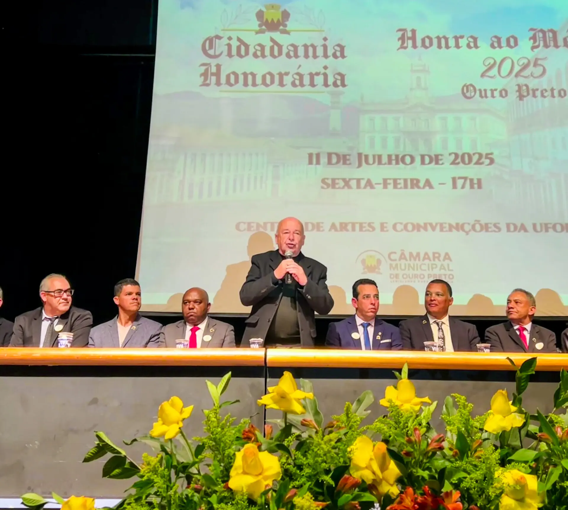 Durante cerimônia realizada nesta sexta-feira (11), no Centro de Convenções da Universidade Federal de Ouro Preto (UFOP), o prefeito Angelo Oswaldo (PV) demonstrou apoio ao presidente Luiz Inácio Lula da Silva (PT) e fez críticas ao presidente dos Estados Unidos, Donald Trump após o ‘tarifaço’ de 50% imposto ao Brasil. O posicionamento ocorreu na solenidade de entrega do título de Cidadania Honorária e da Comenda Honra ao Mérito promovida pela Câmara Municipal de Ouro Preto.