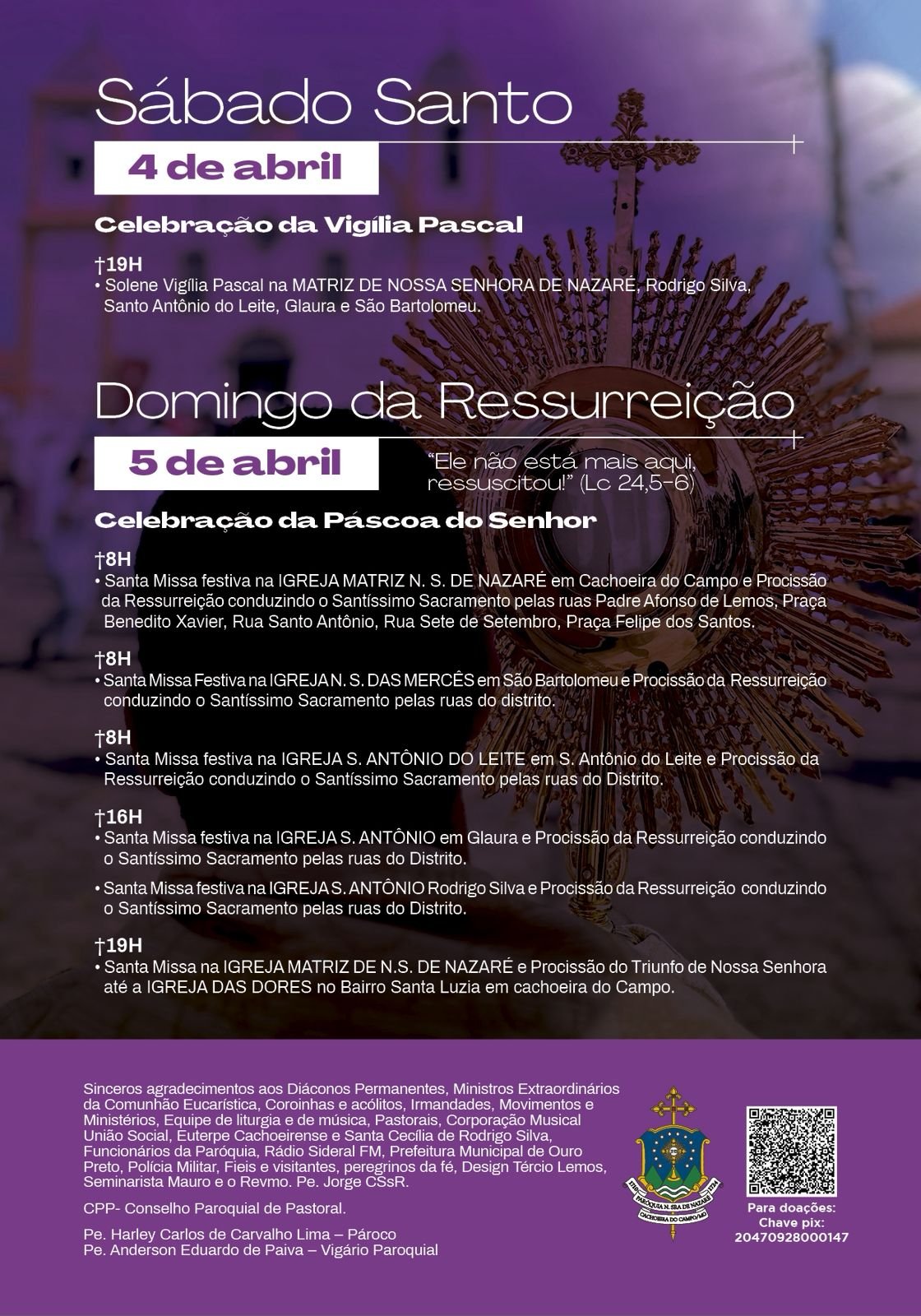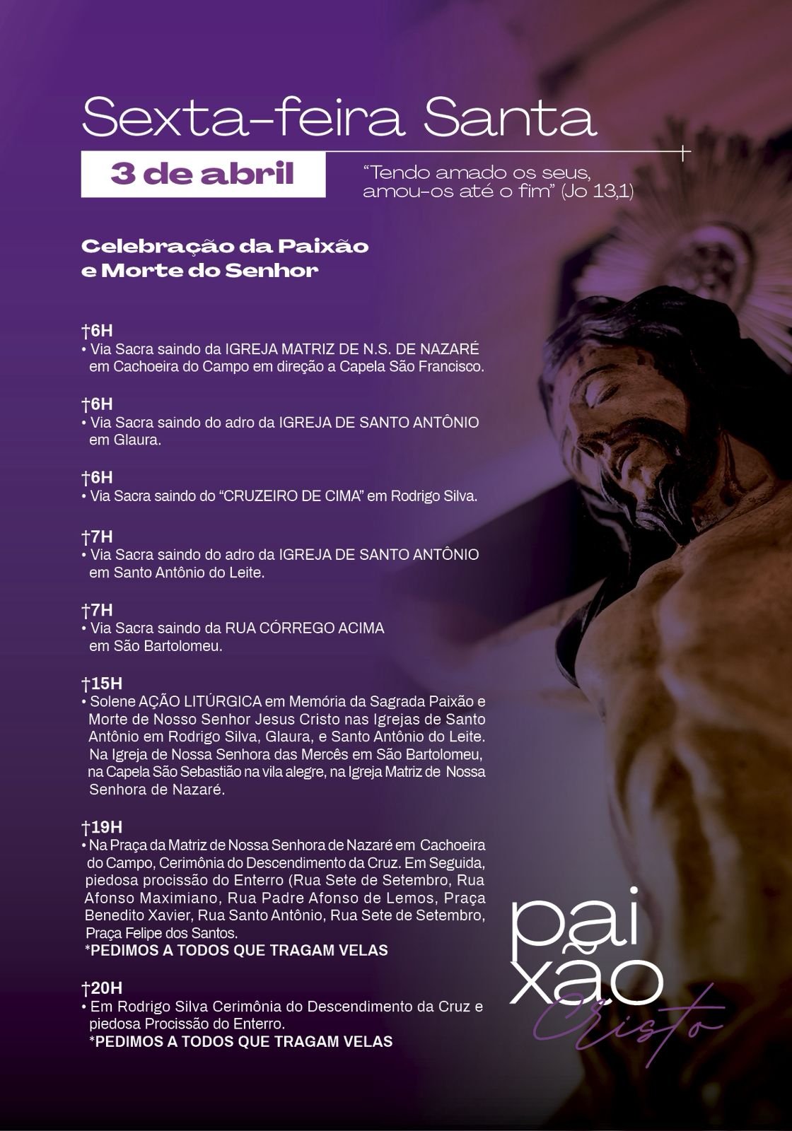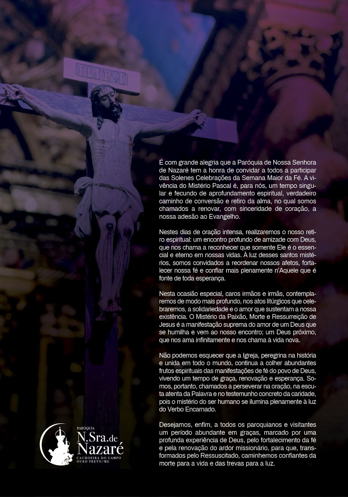 “Quero convidar a todos vocês para as celebrações da Semana Santa, a semana maior da nossa fé. Nossa programação é extensa e teremos celebrações nas comunidades, nos distritos e também na Igreja Matriz de Nossa Senhora de Nazaré em Cachoeira do Campo. Todos se sintam acolhidos na Casa de Deus”, afirmou.